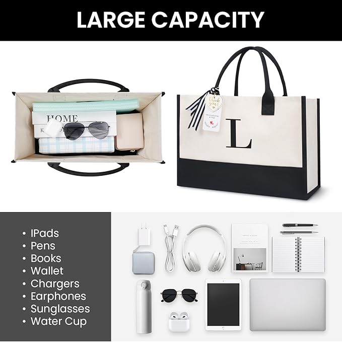 BAGAIL Initial Tote Bag, Personalized Birthday Gifts for Women, Teacher, Friends, Mom, Wedding, Monogrammed Beach Bag