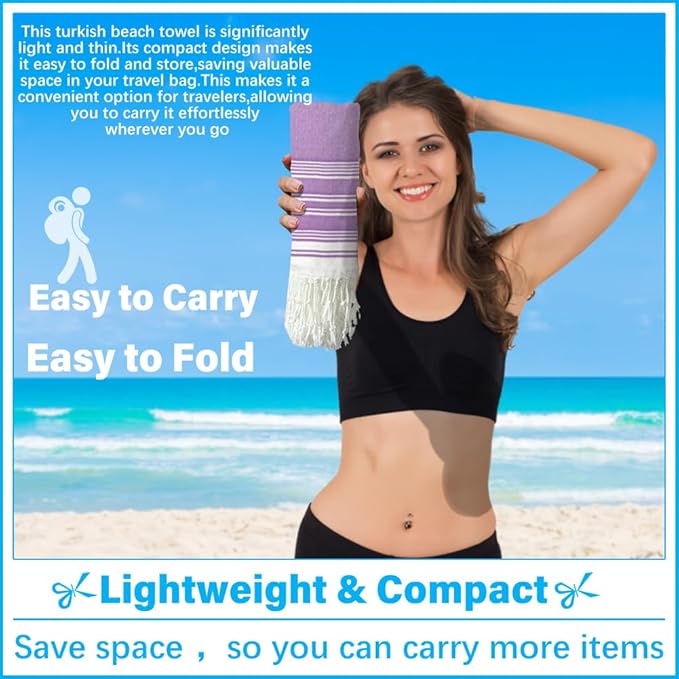 - LIGHTWEIGHT AND COMPACT:This turkish beach towel is significantly light and thin.Its compact design makes it easy to fold and store,saving valuable space in your travel bag.This makes it a convenient option for travelers,allowing you to carry it effortlessly wherever you go