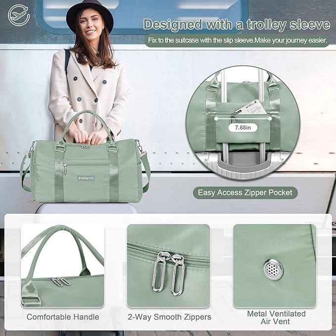 FIORETTO Womens Gym Tote Duffle Bag with Toiletry Bag, Sports Duffel Overnight Hospital Workout Carry on for Girls with Wet Pocket & Shoe Compartment, Ideal for Travel, Swimming, Celadon