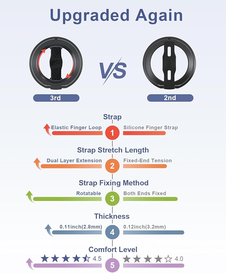 - Comfortable Elastic Phone Grip: This strap features a more comfortable and highly stretchable, high-elastic strap. With its extended length, it greatly reduces the pressure on the fingers when using the strap. The strap is fixed on a rotatable inner ring, allowing you to easily adjust your phone to the most comfortable angle while using the grip.