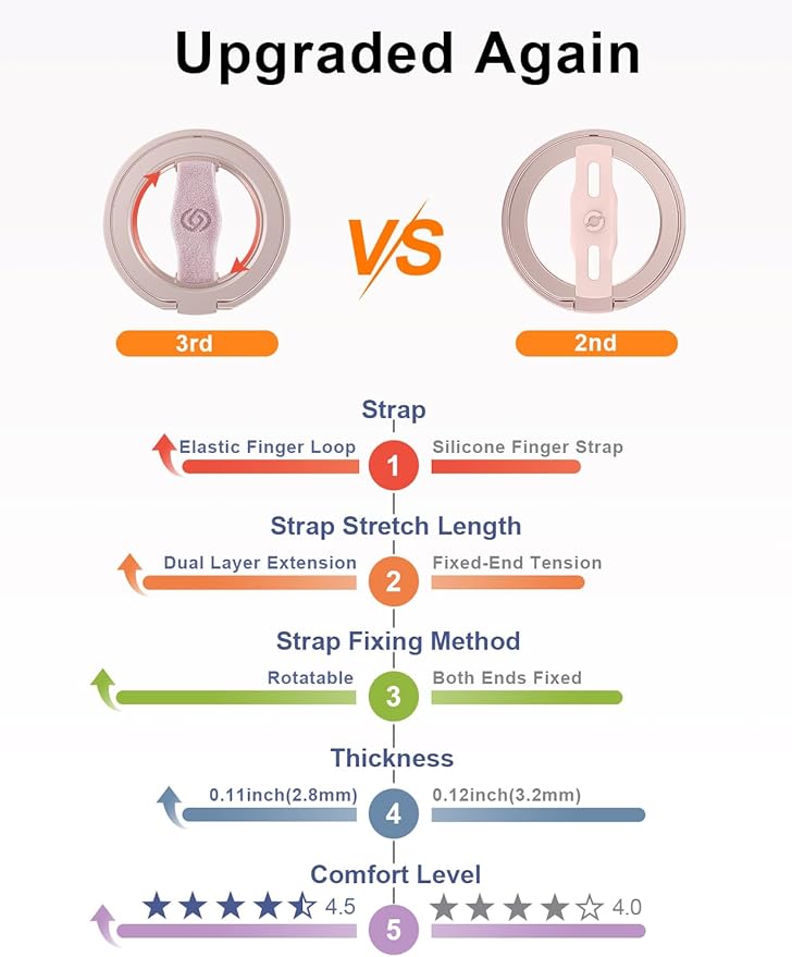 - Comfortable Elastic Phone Grip: This strap features a more comfortable and highly stretchable, high-elastic strap. With its extended length, it greatly reduces the pressure on the fingers when using the strap. The strap is fixed on a rotatable inner ring, allowing you to easily adjust your phone to the most comfortable angle while using the grip.