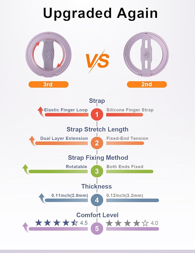 - Comfortable Elastic Phone Grip: This strap features a more comfortable and highly stretchable, high-elastic strap. With its extended length, it greatly reduces the pressure on the fingers when using the strap. The strap is fixed on a rotatable inner ring, allowing you to easily adjust your phone to the most comfortable angle while using the grip.
