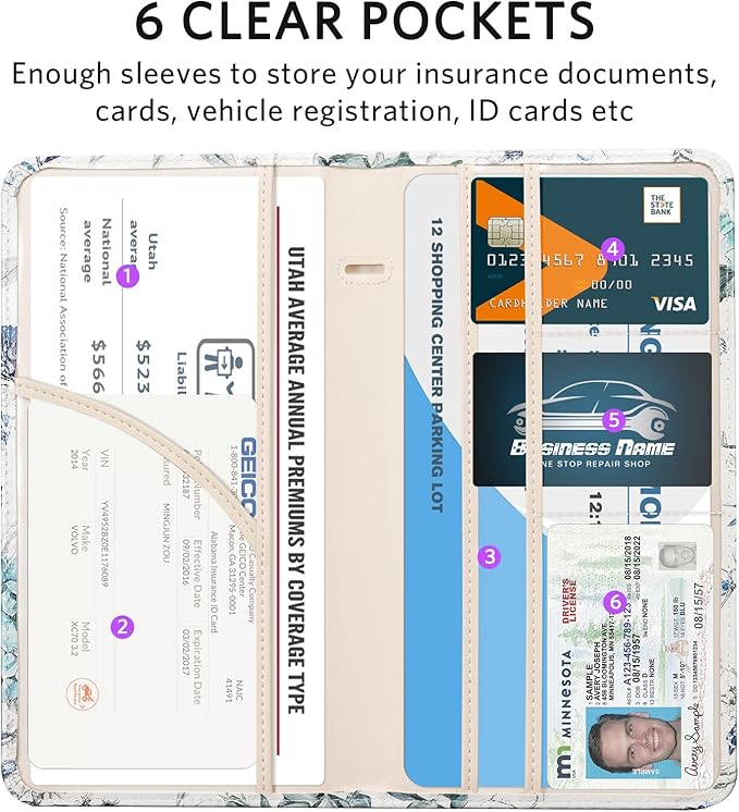 - 6 Comparments: Comes with 3 large pockets for insurance documents, vehicle registrations cards and other valueable information. And 3 small pocket for driver's license, ID cards, business cards, key contact information cards.