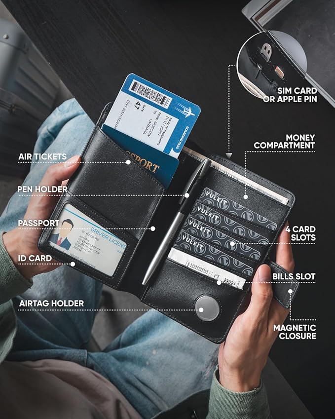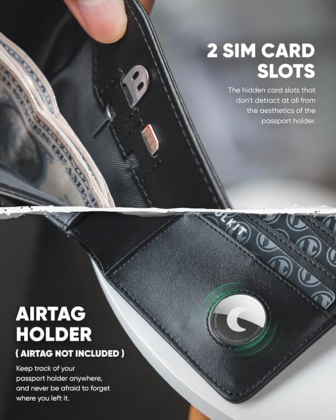 - Travel Passport Organizer- Includes a passport compartment, 2 SIM card slots, 4 credit card slots, a bills slot, an Airtag holder, an ID window, an air tickets compartment, a cash compartment, and a pen holder. Multi-purpose will be convenient for travellers or business men.
