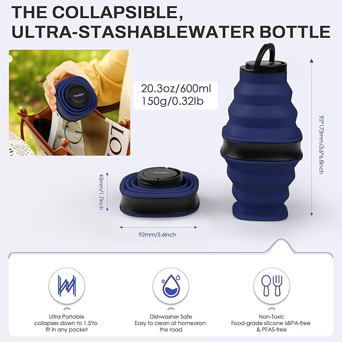 Collapsible Water Bottles,600ml BPA Free Reusable Lightweight LeakProof Silicone Foldable Water Bottle for Travel Hiking Camping Sports,Collapses to 1.5” & anti-Collapse Ring,Dark Blue