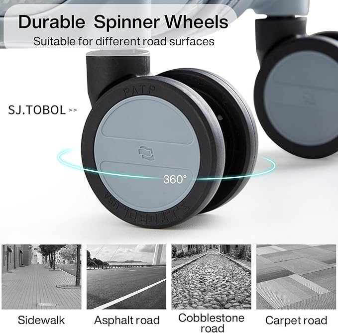 - 【High Quality Accessories】SJ . TOBOL durable spinner wheels,It is composed of precision shaft center and thickened TPE wheel skin, which is very wear-resistant,quieter and has strong bearing capacity, It is applicable to different roads such as cobblestone road and carpet road. Smooth and durable 5-strand reinforced explosion-proof zipper reverse coil prevents burst zipper. Travel-approved combination lock is safe and convenient. Ergonomics telescopic handle with multi-steps adjustment.
