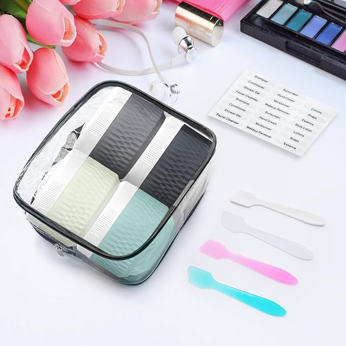 - 【Designed for Travel Accessories】 This toiletries container set includes 1 waterproof bag, 1pcs label sticker,4 travel silicone cream jars, and 4 spatulas! The variety of colors makes it simple to identify the contents of each jar.