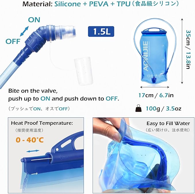 - WATER BLADDER: The hydration vest comes with a 1.5 L hydration bladder; It is made of PEVA material, has a TPU drinking tube, and fits into the back pocket of the vest