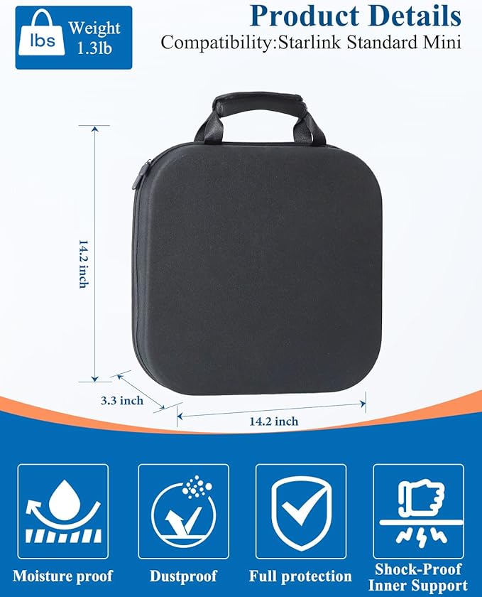 - 【Custom Fit for Starlink Mini】This premium storage case is designed specifically for the Starlink Mini. It includes a protective cushion and sponge holder, providing optimal organization for your device and accessories. Dimensions: 14.2in x 14.2in x 3.3in; Weight: 1.3lbs. Note: The Starlink Mini device is not included, only the carry case.