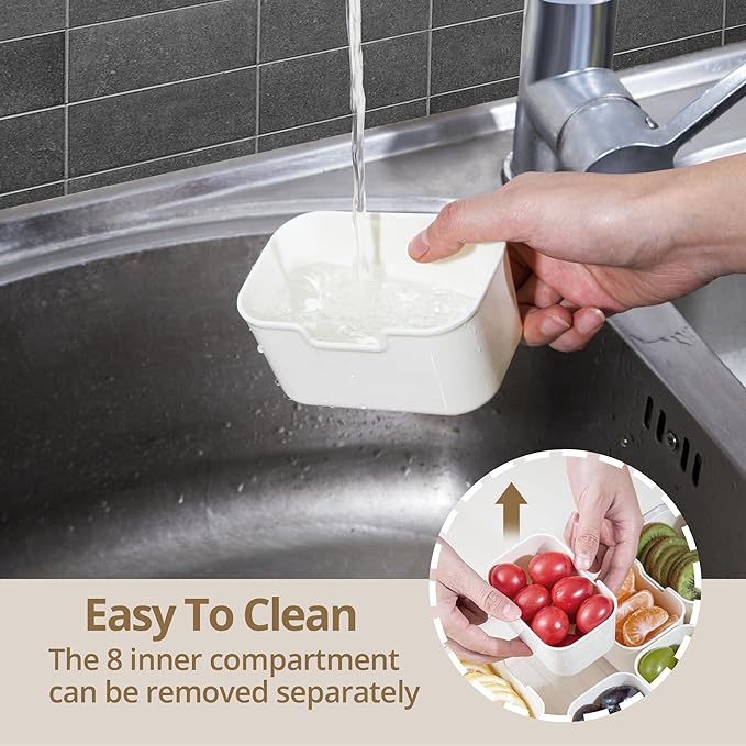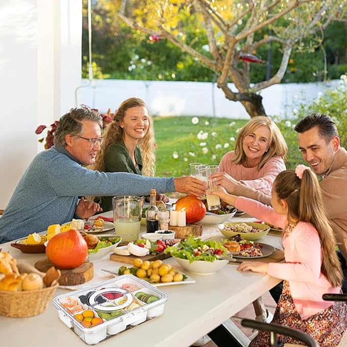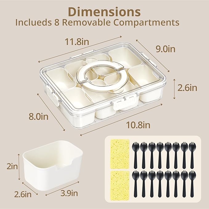 - 【Portable Serving Tray with Lid】The 8-compartment platter is suitable for picnics, the beach, camping at the lake, road trips, movie nights, sporting events and pool days. You can also use it for taco night, meal prep, storing nuts and raisins. Whether it's for a party, picnic or a trip and makes serving snacks a breeze. We also provide you with 8 forks for easy access to your food.