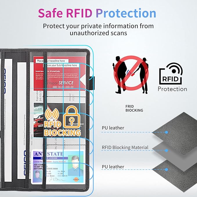 - 【SAFE RFID PROTECTION】This car document organizer wallet is equipped with RFID protective lining which effectively blocks signals from high-tech pickpockets and unauthorized electronic scanning devices. Protect your ID credit/debit card,ATM cards, driver's licenses or other important document information
