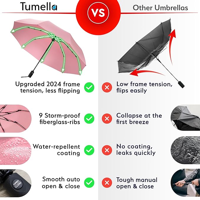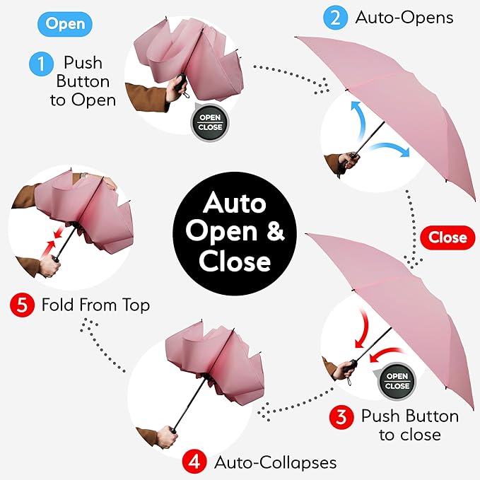 - Engineered for tough storms, this windproof umbrella features a 2025 upgraded frame with 9 reinforced fiberglass ribs, making it one of the most durable compact umbrellas for rain. Its inverted umbrella design resists flipping even in rough winds, offering reliable coverage during commutes and rainy walks. Ideal for business professionals and travelers who need a dependable umbrella large enough to keep them dry.