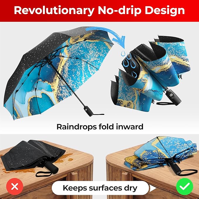 - Stay dry inside and out with Tumella's reverse folding umbrella, designed to fold inward, keeping wet surfaces sealed away. This inverted travel umbrella prevents drips on carpets, car seats, or bags, a perfect car umbrella or urban companion. Compact yet powerful, it's ideal for jumping in and out of Ubers or trains on rainy days without creating a mess. Built for commuters and everyday carry.