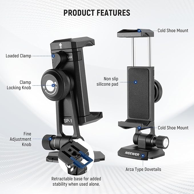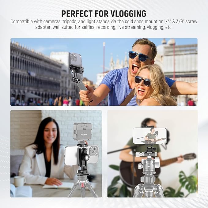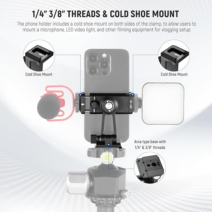 - 【1/4" 3/8" Threads & Cold Shoe Mount】 The 1/4" and 3/8" mounting threads below the Arca type base can be connected to tripods, monopods, light stands, table stands, and handles to take sharp images and videos. The tripod phone holder has two cold shoe mounts to attach LED video lights, RGB lights, microphones, etc.