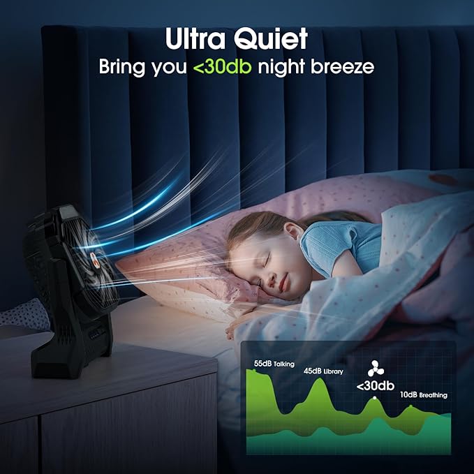 - 4 Adjustable Wind Speeds for Quiet Enjoyment:This rechargeable fan portable features four adjustable wind speeds to cater to your varying needs, keeping you cool whether at home or on camping trips. Utilizing the latest brushless motor technology and high-performance ultra-thin fan blade design, it maintains noise levels below 30dB, allowing you to peacefully sleep in a quiet tent or focus on work while enjoying the perfect balance of tranquility and coolness