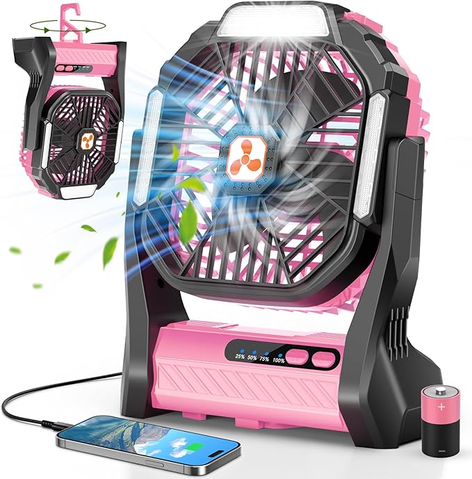 - 20000mAh Rechargeable Fan Portable:This outdoor pink fan features a built-in 20000mAh rechargeable battery, providing approximately 16-60H of continuous operation across various modes, ensuring that you always enjoy a comfortable breeze. Equipped with a USB C charging port, the rechargeable fan can be fully charged in just 3 to 5 hours. Can offer emergency charging for smartphones and other devices via its USB port, making it an excellent choice for hot summer days or outdoor adventures
