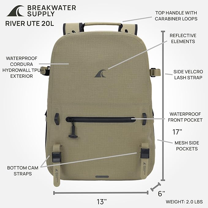 Breakwater Supply™ River Ute Waterproof IP68 Hunting Backpack, Floating TPU Submersible Dry Bag with Padded Hip Belt and Airtight Zippers | 20L (River Ute 20L CORDURA Safari Tan)