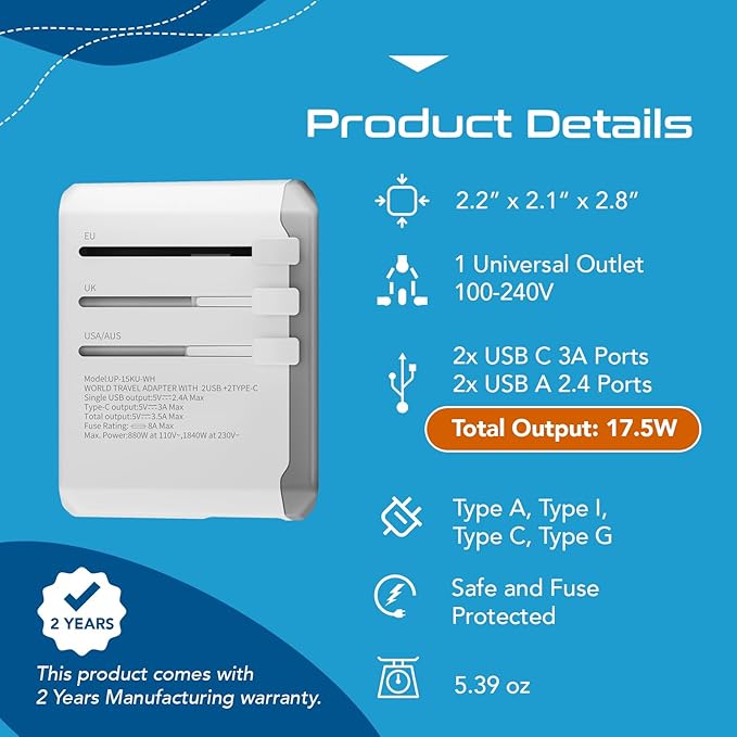 - [WORLD TRAVEL ADAPTER WITH USB PORTS] Perfect for modern travelers, this world travel adapter includes 2 USB-A and 2 USB-C ports 17.5 W Max power allowing you to charge up to 5 devices simultaneously. It’s the ideal international adapter for smartphones, tablets, laptops, and more for 110v-240v devices