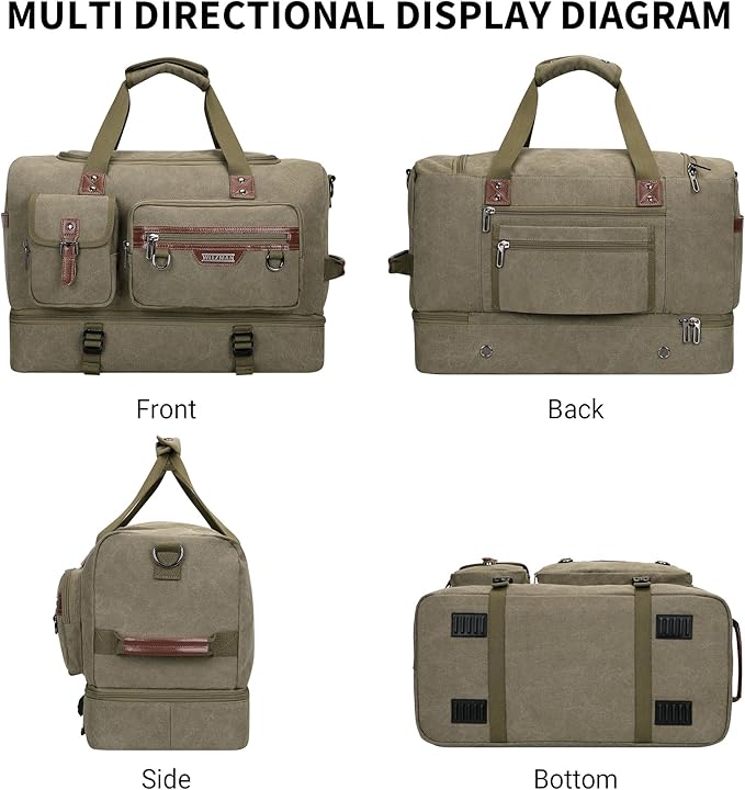 - Material and Dimensions: The travel bag is made from high-quality canvas fabric,Grey polyester lining, soft pressure relief foam hand, practical metal zipper.Dimensions:20.87"L x 10.24"W x 14.17" H(53 x 26x 36cm),Net weight: 1.67kg(3.67lbs).This product is only for adult.