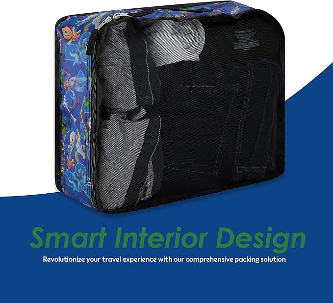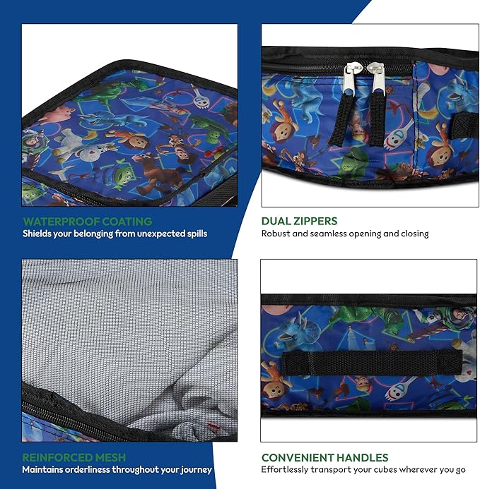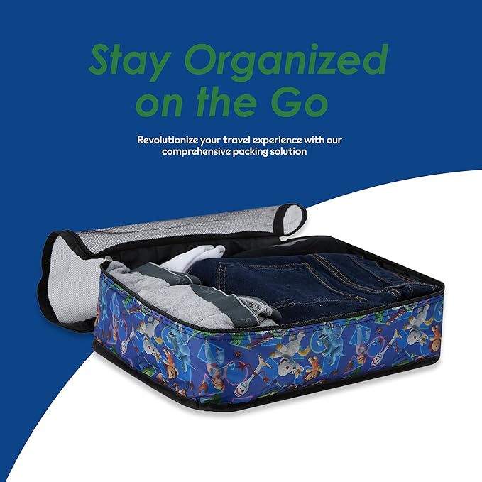 - Complete 5-Piece Organizer Set: Master packing with these luggage bags for travel: large compression cube (13" x 18" x 5.5") for clothes, medium organizer (12" x 16" x 5.5") for essentials, small packaging cube (11" x 13" x 5.5") for accessories, and flat pouch (6" x 10") for documents. Featuring Disney-themed accents and mesh panels for visibility. Perfect for organizing any suitcase or carry-on, these travel bags organizer for luggage include convenient handles and durable zippers.