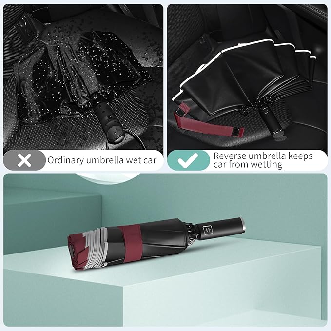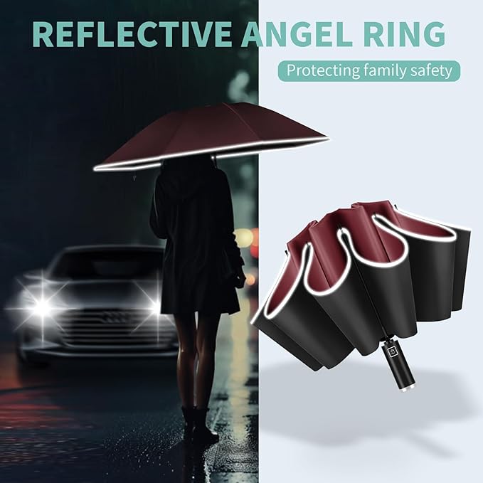 - Elevated Inverted Umbrella: Redefine your rainy day experience with Yoobure folding umbrella! Its unique inverted design allows the wet canopy to fold inside, with no splashes or drips, keeping you and the floor dry and mess-free! Plus, for added security, the travel umbrella compact features a reflective edge to enhance visibility, alerting the passing vehicles on gloomy days.