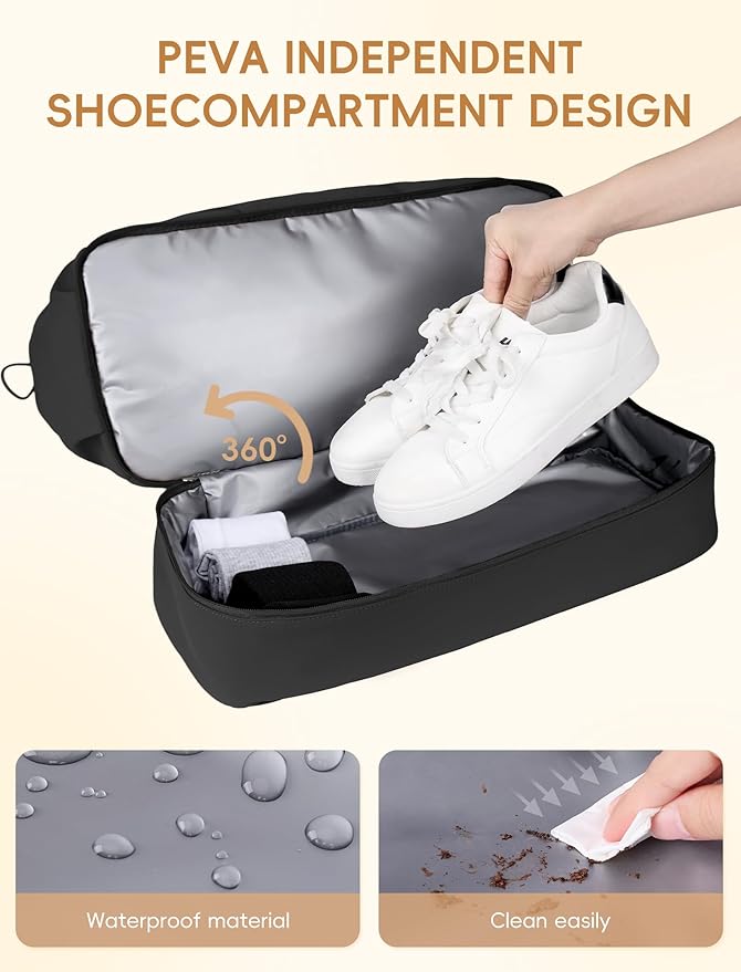 - Multi-pocket design: The travel duffel bag has 1 independent shoe compartment made of PEVA material, which is waterproof and stain-resistant. There are 2 mesh pockets in the main compartment, 1 PVC dry and wet separation bag, and 1 computer compartment that can accommodate a 15.6-inch laptop. The exterior is equipped with 2 side pockets and 1 front zipper pocket.