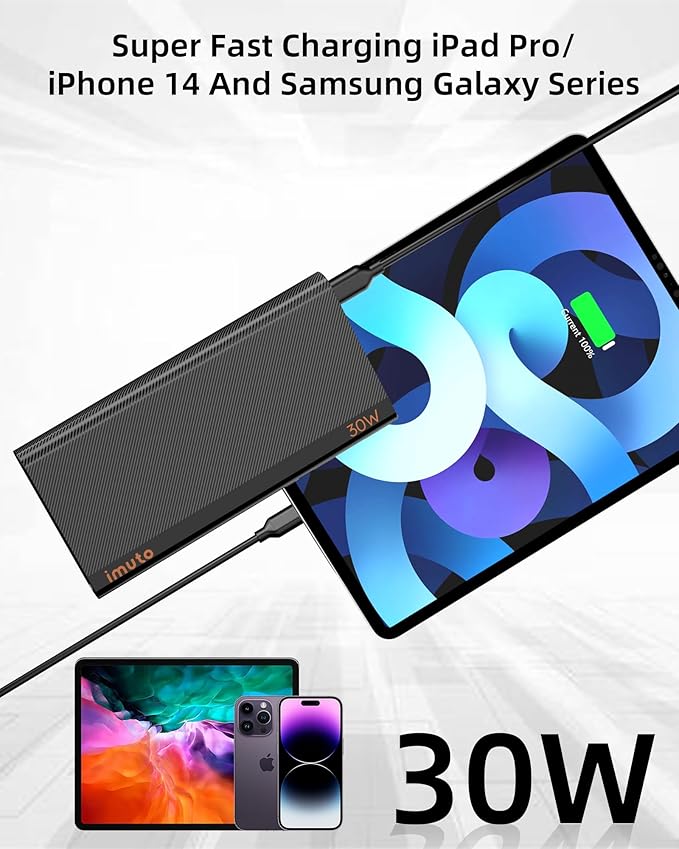 - 【30W High-Speed Charging】With cutting-edge fast-charging technology, the imuto 30W portable charger power bank can fully charge your iPhone 14 in just 2 hours, over twice as fast as traditional 2.4A and 2.1A charger.