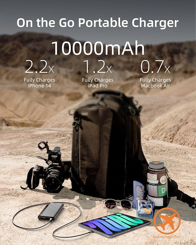 - 【Power That Lasts for Weeks】Despite its slim profile, this powerful 10,000mAh power bank can charge a Samsung S8 2 times, charge an iPhone 8 3.3 times, charge a Galaxy S22 1.8 times, charge AirPods Pro 11.5 times, charge an iPad Mini 1.6 times.