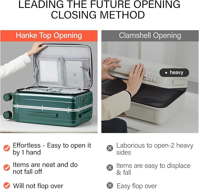 - 【CREATIVE FRONT OPENING】This trunk luggage with spinner wheels Leading the future opening and closing method which is effortless to open or close the suitcase, not only is it easy to load, but it also saves space. This design solves the problem that traditional luggage separated 2 compartments of heavy load then it's difficult to open and close. Importantly, it also avoid the displacement of items.