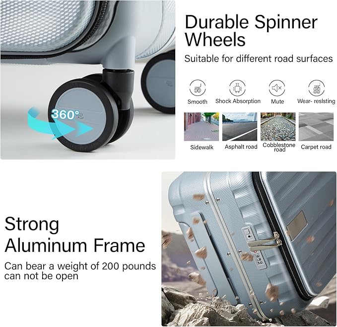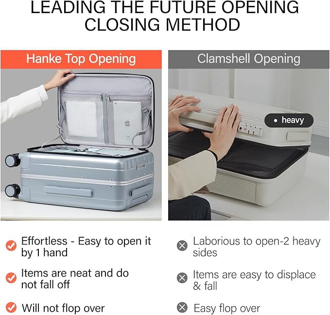 - 【CREATIVE FRONT OPENING】This trunk luggage with spinner wheels Leading the future opening and closing method which is effortless to open or close the suitcase, not only is it easy to load, but it also saves space. This design solves the problem that traditional luggage separated 2 compartments of heavy load then it's difficult to open and close. Importantly, it also avoid the displacement of items.