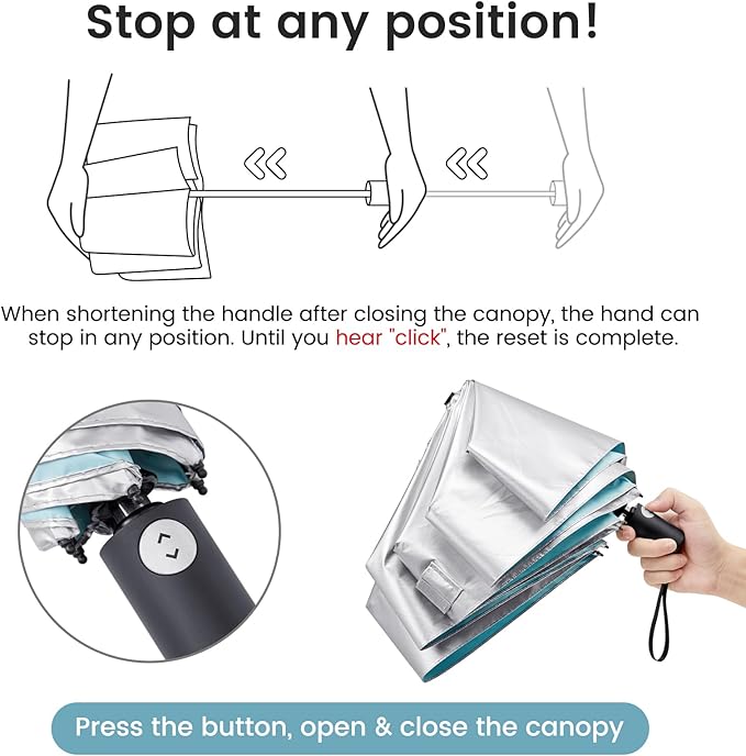 - 【Easy Automatic Open & Close With Safety Anti-rebound】The automatic umbrella can be operated with one hand. A special anti-bounce close function allows you to reset with very little pressure, and stop in any position without bouncing and hitting yourself. Remember to pull it back fully until you hear a click to complete the reset.