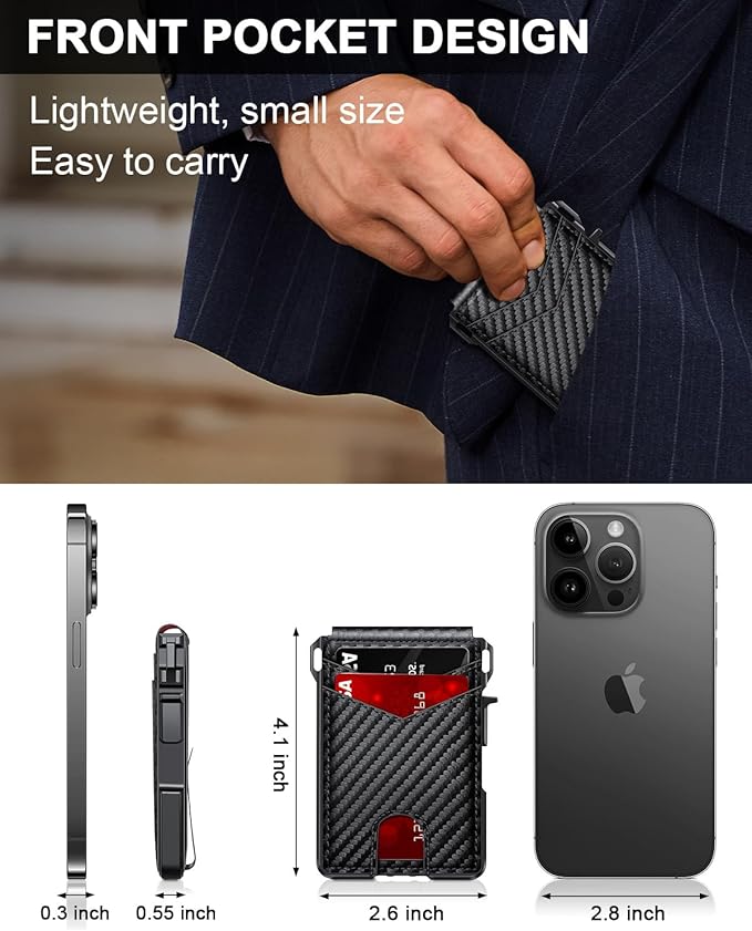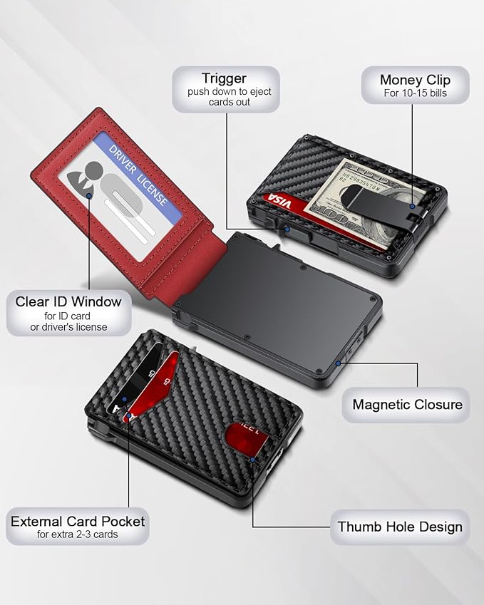- CLEAR ID WINDOW: On the inside of the carbon fiber wallet, which has an ID card holder slot, which allows you to swipe the card without removing the card. It can be used to store ID card, work card, driver license, access card, traffic card, etc.