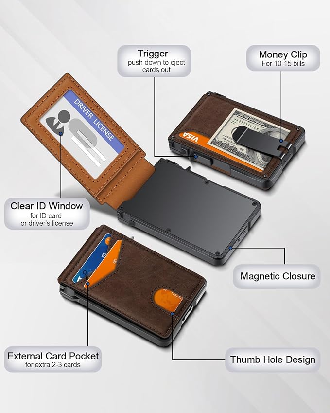 - QUICK ACCESS: Unlike traditional leather wallet, this mens slim wallet is equipped with the ejection mechanism. Simply press the side button on the card holder, all cards pop up at a step pattern that makes them very easy & convenient to take out.