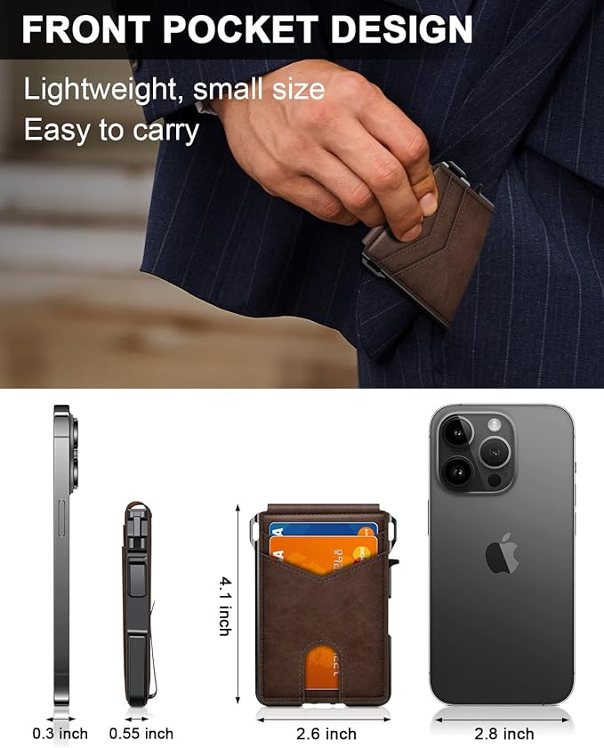 - SLIM BODY, LARGE CAPACITY: This mens minimalist wallet holds up to 12+ cards. The aluminium chamber holds 6-8 and the leather flap holds 4-6 (1 ID window included). There are also removable money clips on the back capable of holding 15+ cash.