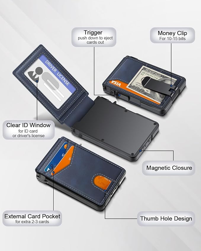 - QUICK ACCESS: Unlike traditional leather wallet, this mens slim wallet is equipped with the ejection mechanism. Simply press the side button on the card holder, all cards pop up at a step pattern that makes them very easy & convenient to take out.