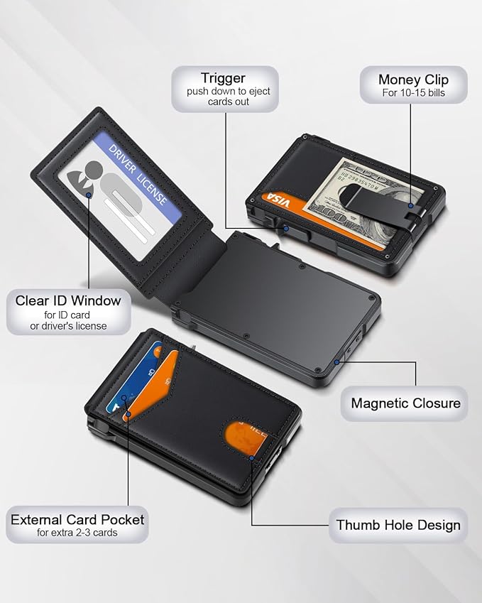 - QUICK ACCESS: Unlike traditional leather wallet, this mens slim wallet is equipped with the ejection mechanism. Simply press the side button on the card holder, all cards pop up at a step pattern that makes them very easy & convenient to take out.