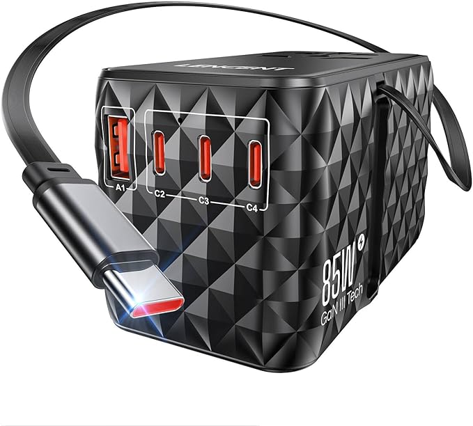 - USB-C Fast Charging: The universal power adapter features a built-in USB-C cable for convenient charging at up to 70W (when used individually). 3 additional USB-C ports (C2/C3/C4) also provide 70W each, and the USB A1 delivers up to 60W, with a total max output of 85W, ensuring fast and efficient charging
