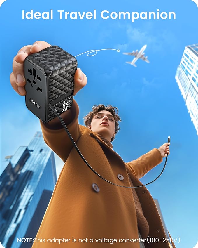 LENCENT 85W Universal Travel Power Adapter with Retractable USB C Cable, GaN International Travel Adapter with 1 USB-A & 3 Type C Fast Charging, Worldwide Plug Adaptor for US to EU UK Type C/G/A/I