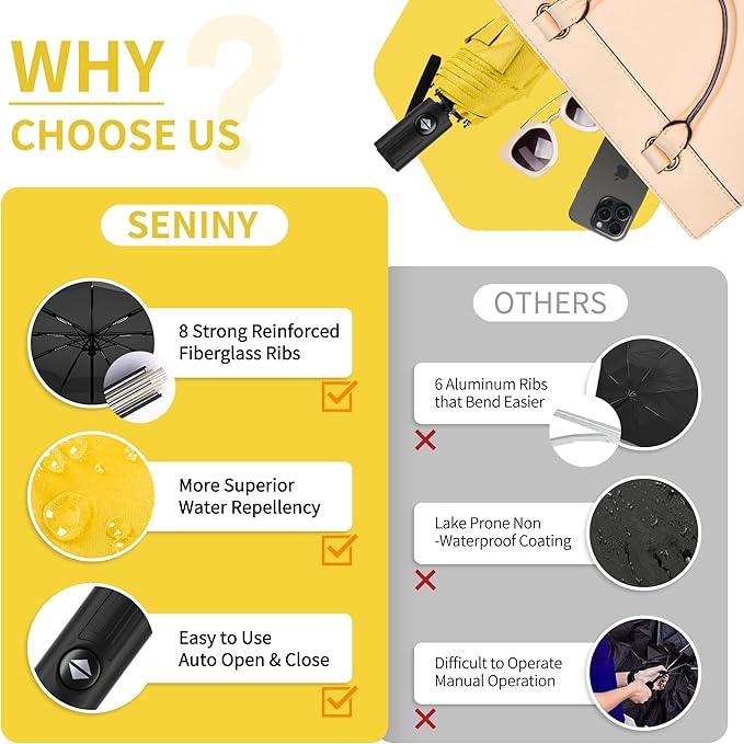 - 【Reliable UV Block and Rainproof】The premium coated yellow umbrella offers UPF50+ protection that blocks up to 99% of UV rays, making it your perfect summer companion. When it rains, the high-density waterproof fabric of the automatic umbrella keeps you well-covered. Thanks to its quick drying, the mini umbrella for travel is easy to refold quickly.