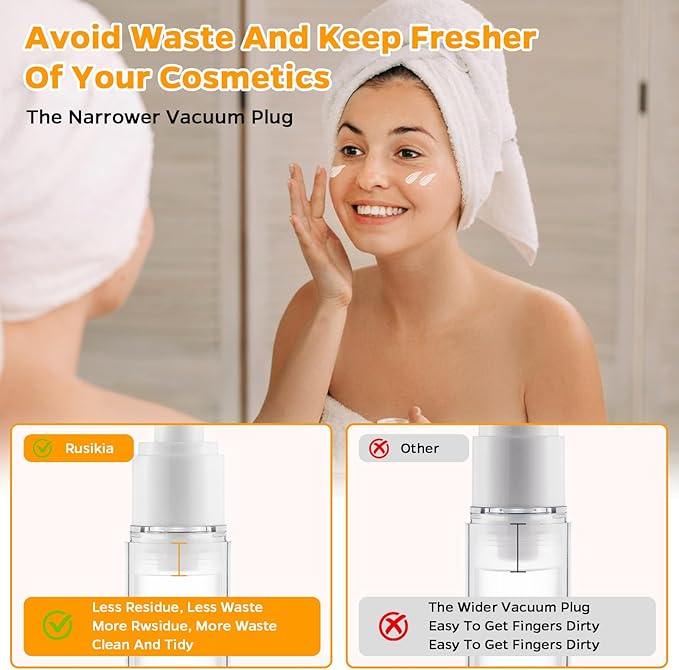 - High Quality Airless Pump Bottles Jars: Our 13 pack airless cosmetic pump container set with 1 waterproof bag, 2pcs cream jars (1*30ml-1floz, 1*15ml-0.5floz), 3pcs bottles (1*50ml-1.7floz + 1*30ml-1floz + 1*15ml-0.5floz), 2pcs spray bottles(50ml-1.7 floz+1*30ml-1floz), 2pcs funnels, 2pcs spatulas, 1pcs label! Newly upgraded!more durable lids and bottles, Different accessories for your different needs(Tips: You may receive a different version due to the updated bottle size, please understand!)