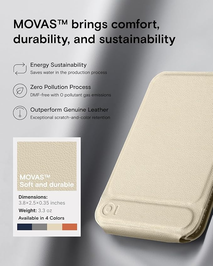 - 3-in-1 & Eco-friendly: This everyday carry features a phone tripod, phone stand and magsafe wallet with a simple fold to transform. It folds into an 8" phone tripod stand in a second. Crafted with the pioneering water-based MOVAS Vegan Leather, it's smooth to the touch while saving water from the manufacturing process.