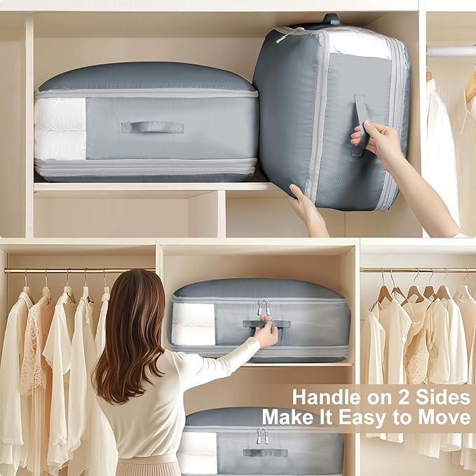 - [Dual Reinforced Handles for Easy Access] Equipped with two strategically placed handles—one on the front and one on the side—our blanket storage bag allows you to easily pull it out whether it's stored horizontally or vertically. The reinforced stitching of the whole bag ensures sturdy support, making it effortless to move or reorganize even when the comforter storage bag is fully packed.