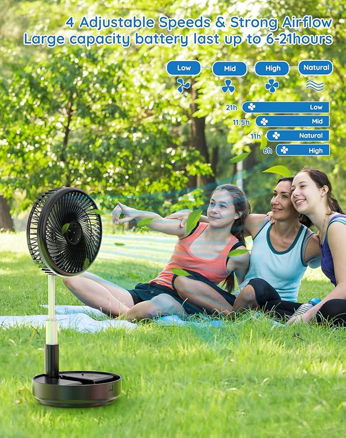 - Portable & Versatile: The rechargeable fan features an adjustable and foldable design that is very easy to store and carry. It could be used on countertop as desk fan, ground as floor fan and bedroom as standing fan to meet your different needs. You can put it in your bag and carry it with you all summer long whether you are at home, office or outdoor activities such as travel, camping,picnics, barbecue