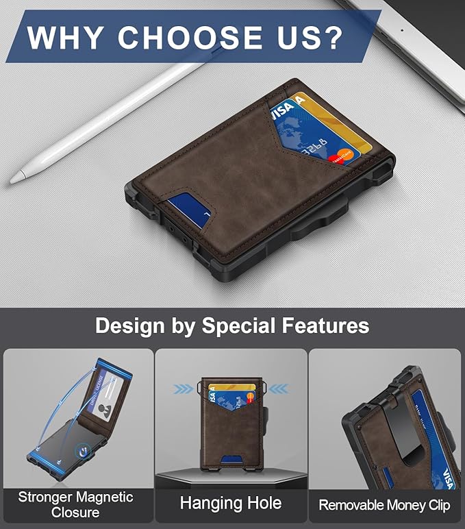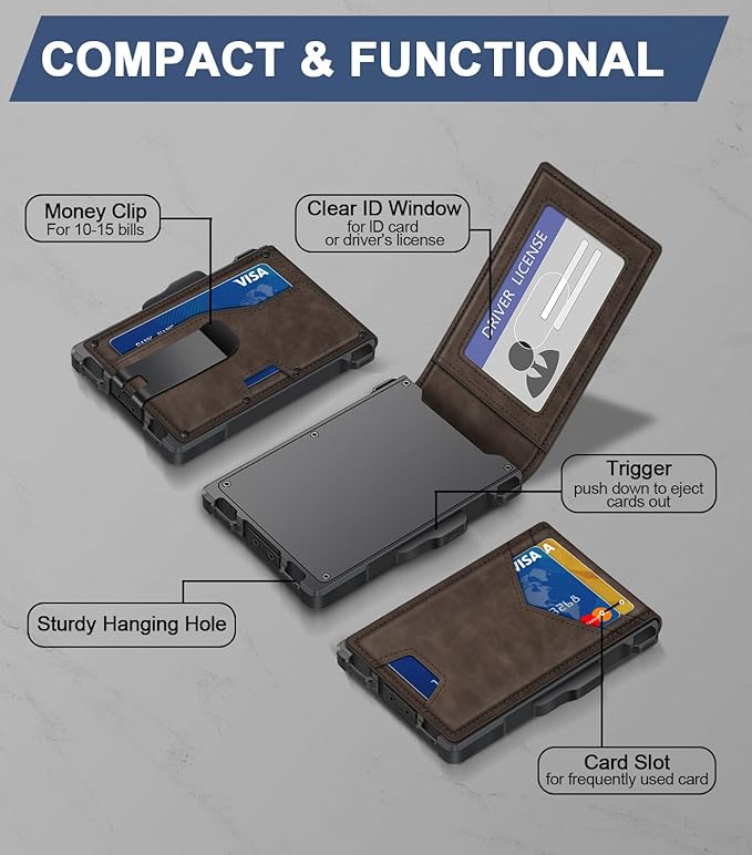 - UPGRADED DESIGN FOR QUICK ACCESS: GHUKY card wallet combines high-quality leather and premium metal, featuring a smooth pop-up mechanism. Its ergonomic design allows for effortless card retrieval with a gentle slide of the side button.