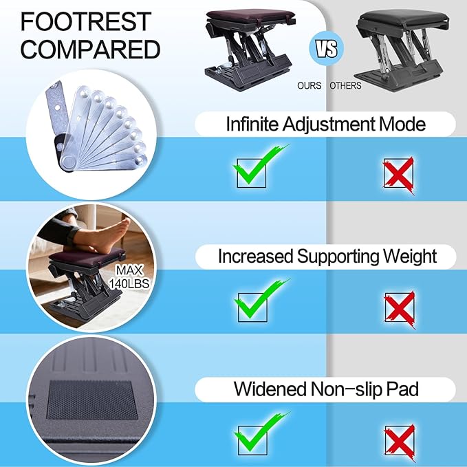 - 【Adjustable Angles & Height】 Smooth hinge design allows easy adjustment for multiple positions. Provides ergonomic support, relieves foot and leg strain, promotes circulation, and helps reduce discomfort from long sitting for a more relaxed workday.