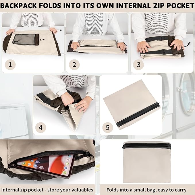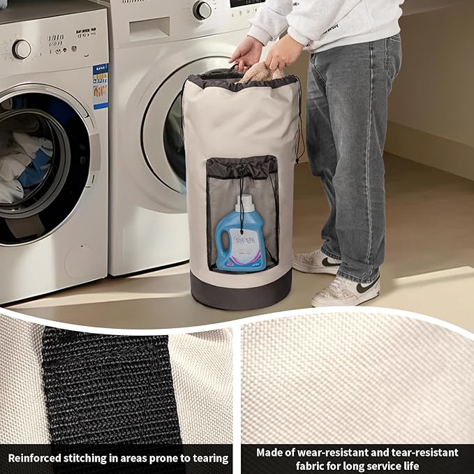 - 【Extra Pocket & Foldable】Front mesh pocket with drawstring closure provides extra storage space for laundry detergent or fabric softener. Interior zipper pocket (10.2" x 7.8") can store coins, wallet and cell phone. When not in use, flip the interior zipper pocket and fold the laundry backpack inside for storage