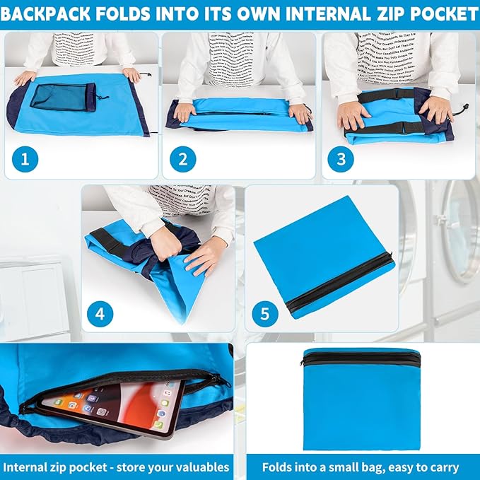 - 【Extra Pocket & Foldable】Front mesh pocket with drawstring closure provides extra storage space for laundry detergent or fabric softener. Interior zipper pocket (10.2" x 7.8") can store coins, wallet and cell phone. When not in use, flip the interior zipper pocket and fold the laundry backpack inside for storage