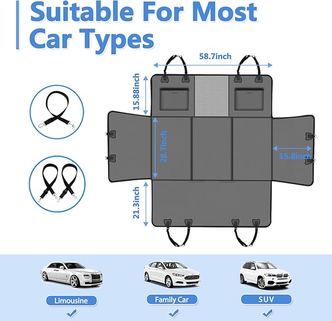 - UNIVERSAL FIT WITH SEAT BELT OPENINGS & STORAGE POCKETS: Includes built-in seat belt openings compatible with dog harnesses and child car seats. Two storage pockets keep leashes, toys, and treats organized—so your back seat stays tidy and your pet happy.