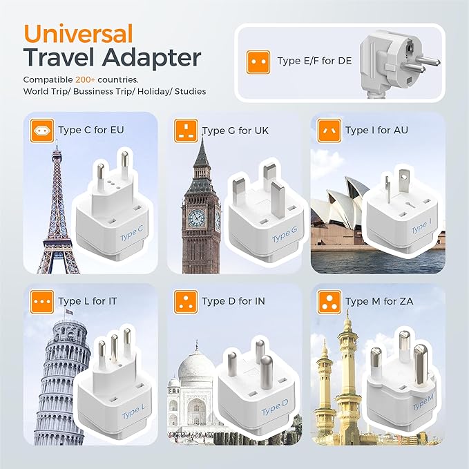 - Travel Voltage Converter: The 220V to 110V converter adapter equipped with a DE plug and 6 international adapters (Type C, G, I, L, D, M ), this power converter can works in Europe, UK, Italy, Australia, India, South Africa, Germany, China, Dubai, Greece, New Zealand, etc