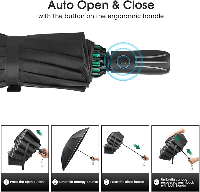 - 【Auto Open/Close and Convenient】 Just press the button to open/close the canopy instantly. The ergonomic handle with stripes is non-slip and comfortable to use. The folding size is only 13.9 inches, and it comes with a portable umbrella cover, which is easy to carry and doesn't take up much space. Stored in your car, briefcase, backpack, travel bag, suitable for travel and outdoor activities, for men and women.